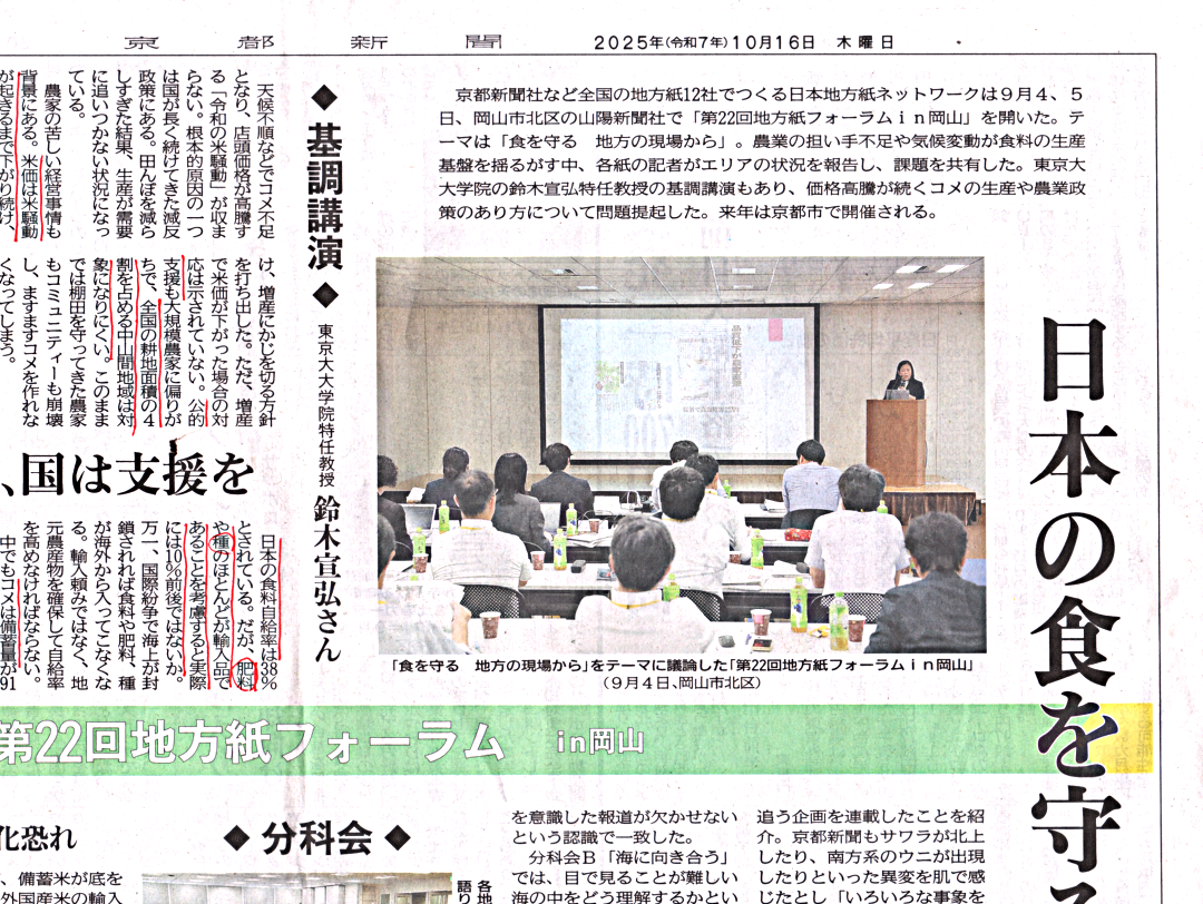 かくのごとく、水無月の初日は、有難い電話と、こうした思い出を振り返ることで明けた。その上に、15日後のこと。京都新聞は「農業は国防」との一面記事を掲載した。