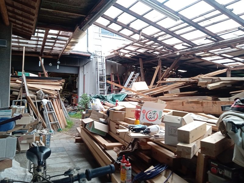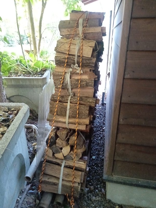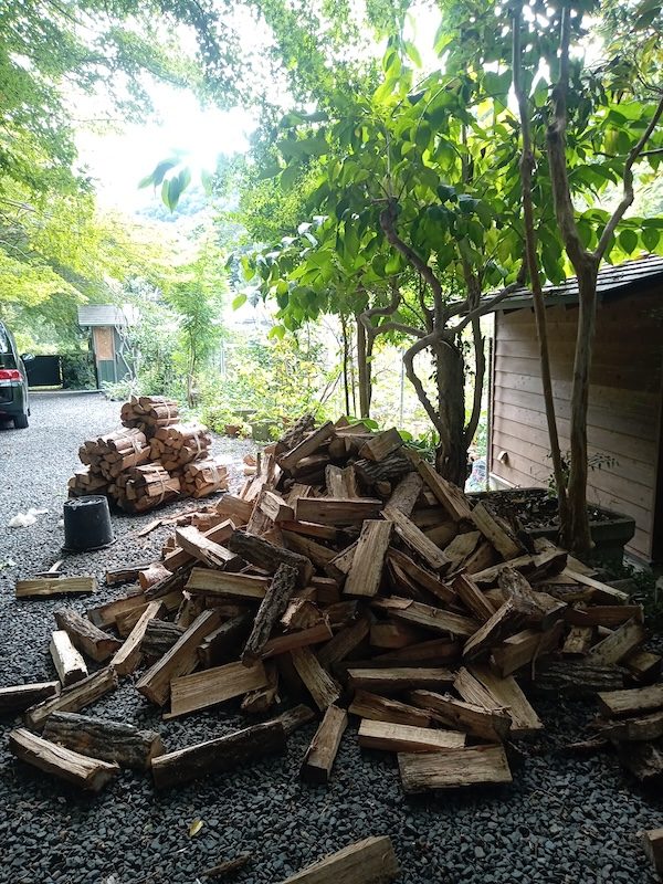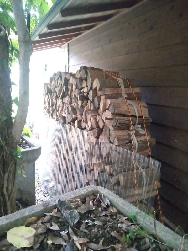 3)個離庵横に積んだ薪が、自然倒壊。原因は地震ではなく、土台の竹の丸太がシロアリに蝕まれていた。昇さんと積み直し、雨除けをして、湿気ないようにした。この最中に、喫茶店の「メニューを読んだ」と言って、お客さんが近づいてきて、激励してもらえた。