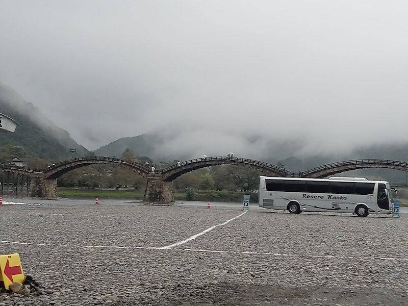 翌朝、小雨の岩国に移動。錦帯橋の見学者用パーキングは広い川原にあった。海老原棟梁には、出て来ていただけることになった。