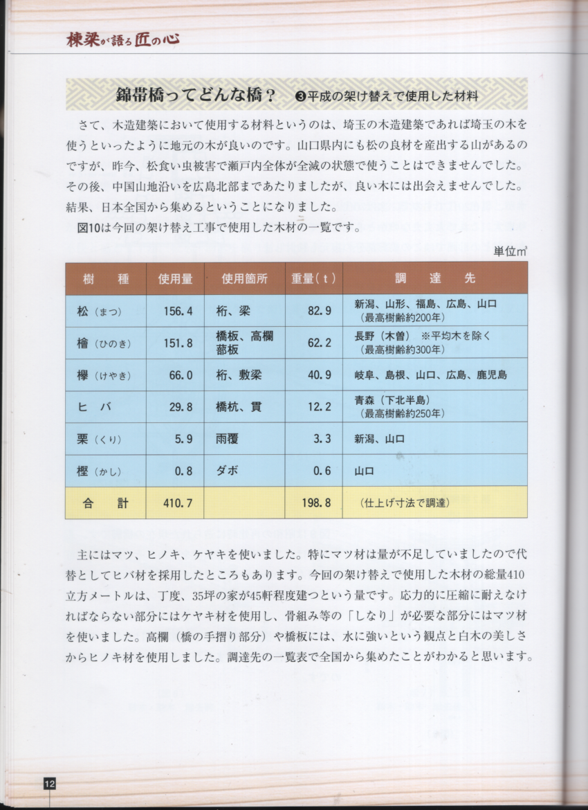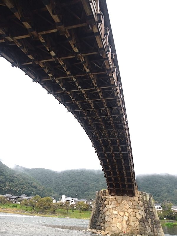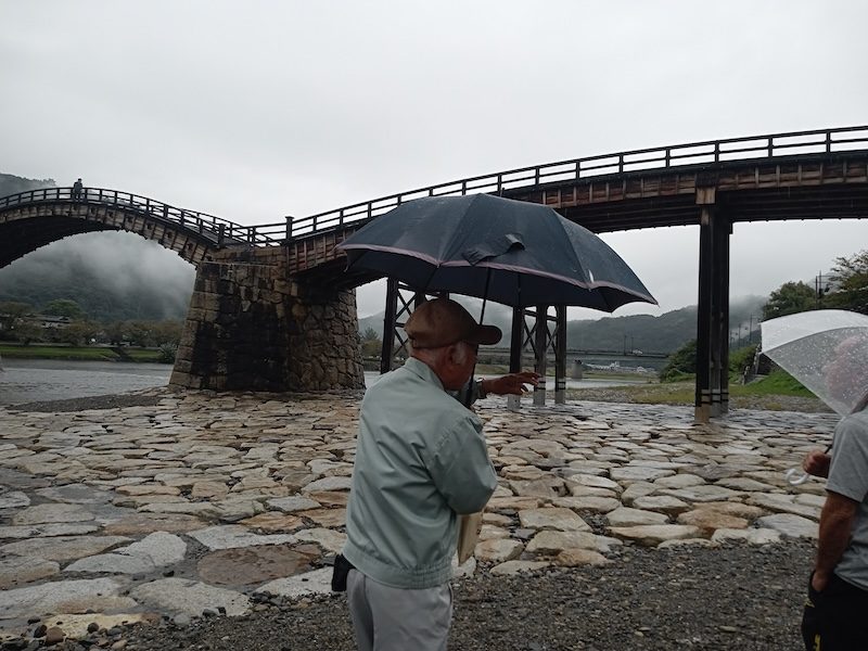岩国では、創建1673年来、350年余の歴史を誇る錦帯橋(海老崎家という棟梁一家が、江戸時代から世襲で護ってきた)を見学できる。しかも、この平成の架け替え工事をしきった棟梁・海老崎粂次(くめつぐ)さん(日本の5大棟梁のお一人)を「お訪ねできそう」だった。