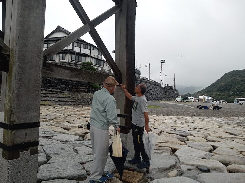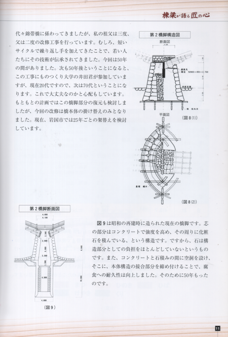 川底は、大きくて平らな石が敷き詰められている。川底にある橋台の基礎を増水がえぐり、崩さないようにする古人の知恵だ。今日では、その石組みの橋台はコンクリートで固めてある。棟梁の説明は続いた。