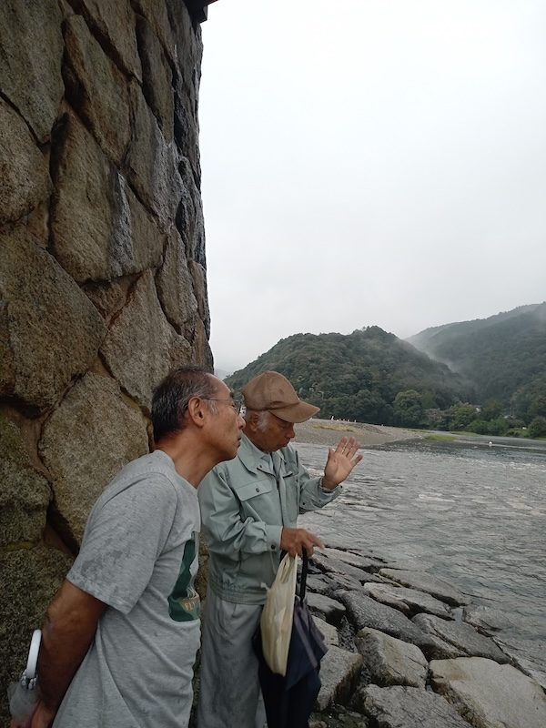 橋の袂にまで登って、棟梁と落ち合った。喫茶店で錦帯橋の歴史などを伺ったあと、再度川原に降りた。橋を見上げる位置から5連の橋の説明を受けることになった。
