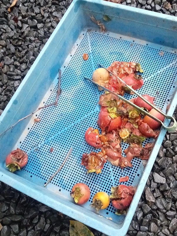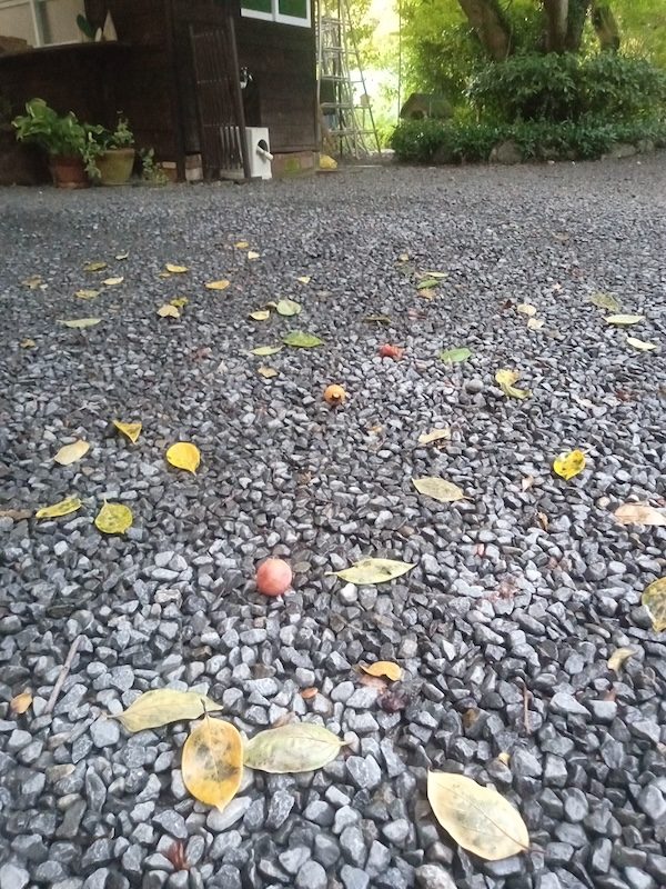 大豊作のカキは虫食いが落ち始めた。朝一番に私は、ある運動に手をつけた。車で出勤する人が敷きつぶす前に、拾っておいた方が、後の手間が省けるし、気分がよくなる。そうと気付き合う運動であった。2日もせぬうちに、運動は行き渡った。