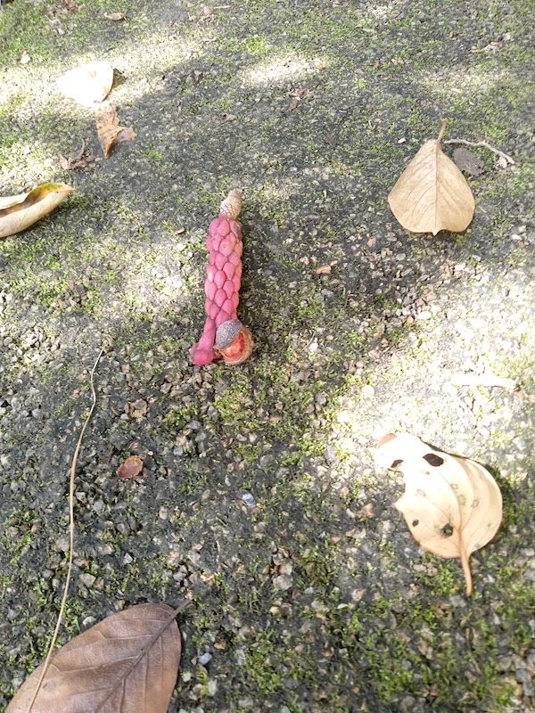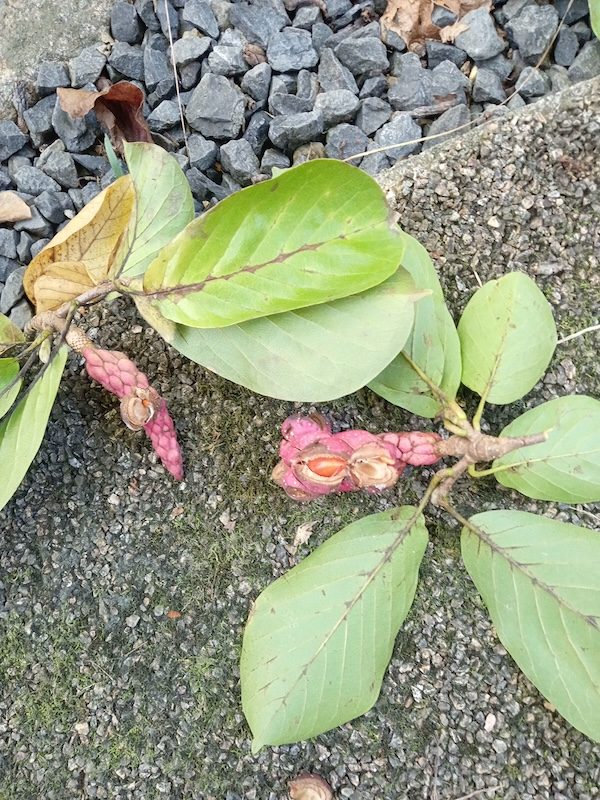 1)ハクモクレンの種房がこの7日に、落下し始めた。結んだタネが熟れ始め、オレンジ色になり、赤く変色した種房ごと落ち始めた。10日にはカラスが見つけたようで、小枝ごと次々と落とし始めた。