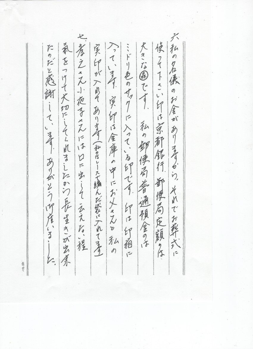 10)今は亡き母の生きがい。書類の整理と処分をしていたら、母の遺言書が混じっていた。生前は、時には妻を「鬼嫁」呼ばわりしたり、「飯焚きババァじゃあるまい」と毒づいたりしていた。その母が、その七番目で、感謝の言葉を綴っていた。この度、改めて(母は平成12年初夏に死んだ。この遺言書は予期せぬところから出てきたので、7年後に第3者も交えて開封し)読んでいる。