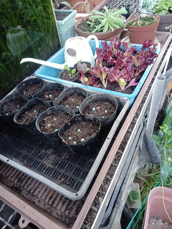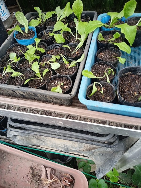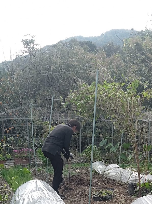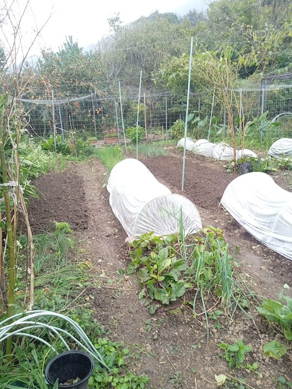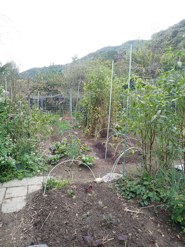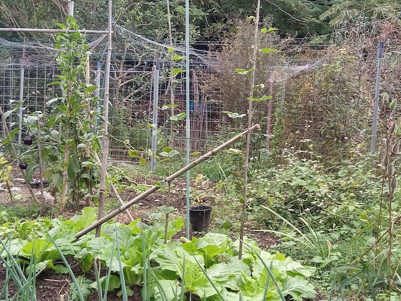 12)月末のわが家の畑は、冬景色に近づいた。夏野菜の3種の支柱を、昇さんは片付け、冬野菜の畝に仕立て直した。私はスナップエンドウやルッコラの作付けや苗づくり。彗生君はイノシシスロープの入り口で、アーチを立てる穴を掘った。来訪を(酷暑中は休んでいたが)再開したフミちゃんと妻は除草に、とそれぞれ励んだ。