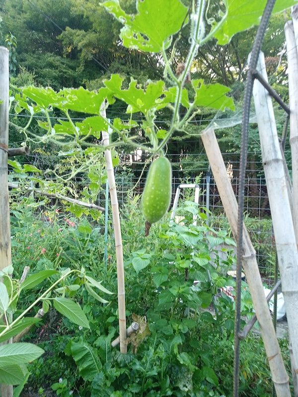 残る支柱は、予期せぬところで唯一発芽したトウガンの支柱と、唯一の実を支えるために追加した支柱だけになった。