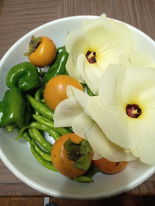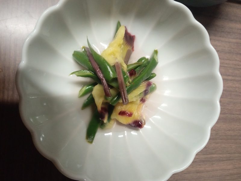 異常な残暑が一転して、すぐに晩秋になるとは思いもよらず、インゲンマメのタネをまいた。かろうじて実を7本収穫。初の調理で、本年最初で最後のインゲンマメの収穫と、その賞味となった。