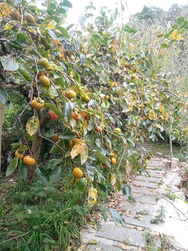 3日の朝を迎えた。洋風の朝食がたっぷり出た。デザートは瞳さんの先月の手土産・イチジクのコンポートの、最後の1つだった。庭ではアイの花が咲き始めており、異常な豊作になったカキが色づき始めていた。