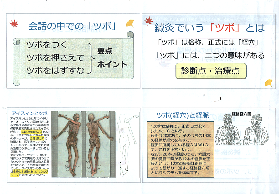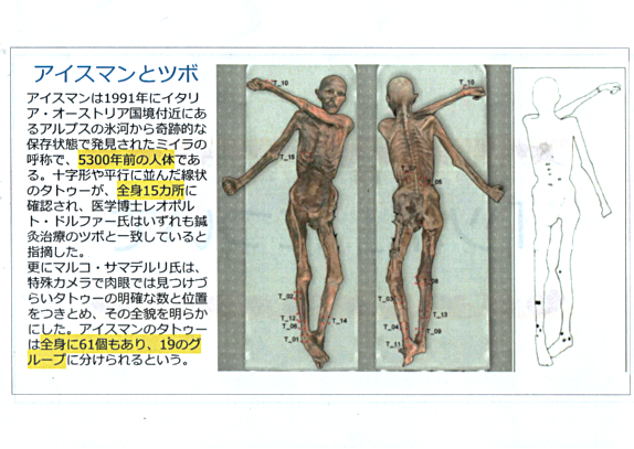 欧州の、5300年前の氷漬けで発見された男性(アイスマン)の身体には、15か所計63個の入れ墨があった。そのいずれもが鍼灸のツボに一致していた。